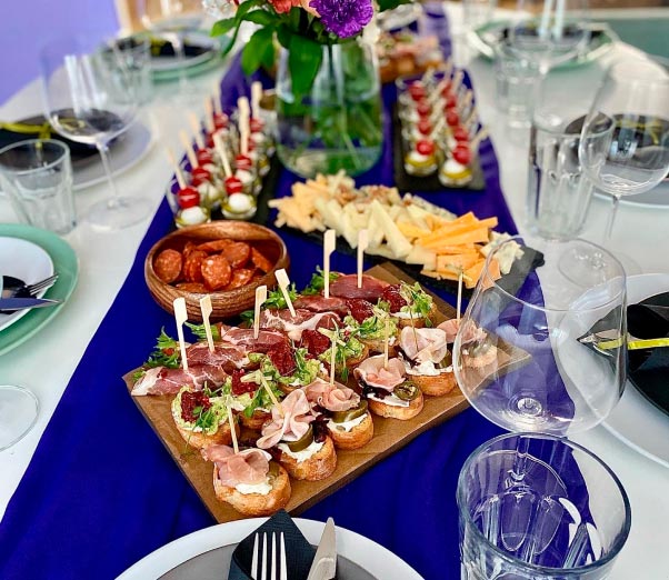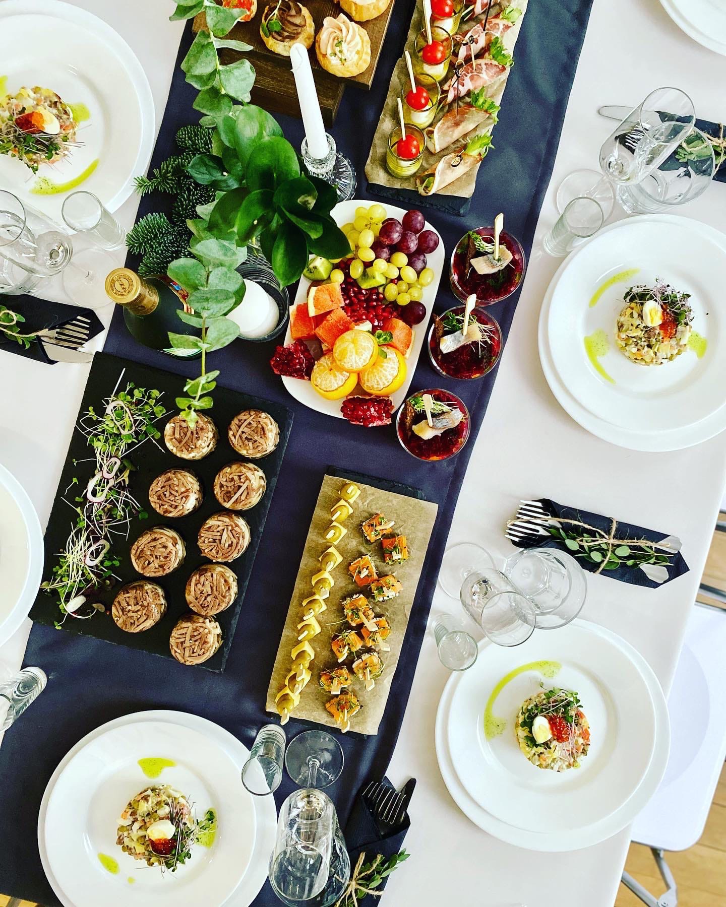 2. Фуршетное меню: состоит из легких закусок, таких как канапе, тарталетки, брускетты, блинчики, рулетики, десерты, фрукты. Обычно подаются без столовых приборов.